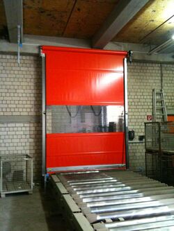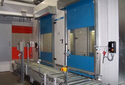 This door is generally supplied with extended side panels that ensure "secure positioning" of the door. The shutter terminates with the existing conveyor system.