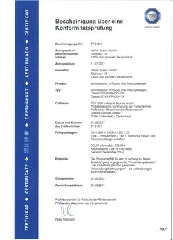 This system is approved by TÜV Süd up to door dimensions of 4000 x 4250 mm (w x h), wherein separate expert inspection (by building contractor) is not necessary. HaWe Speed fitters are authorised to perform this inspection themselves.