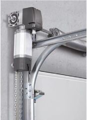 Electric direct mount drive with emergency hand chain. In the event of power failure, the door can thus be comfortably operated from ground level by hand.